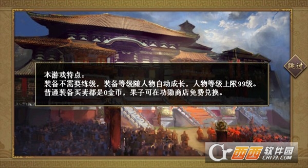 2、游戏介绍装备不需要练级,装备等级随人物自动成长,人物等级上限99级,普通装备买卖都是0金币,果子可在功勋商店免费兑换。