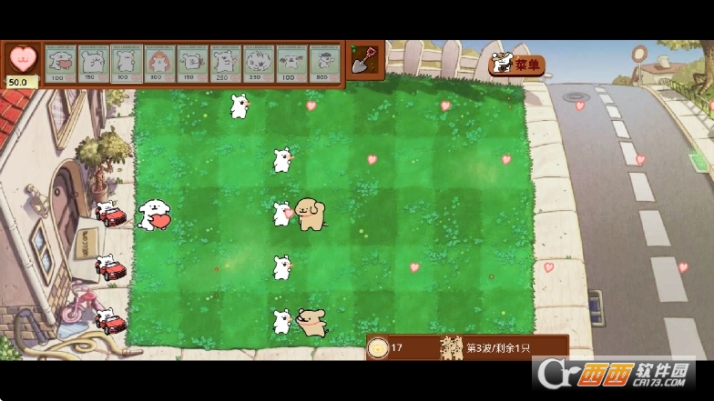 4、在草地上的任意格子内点击,即可将可爱的"植物小狗"放置到位。它会自动攻击进入其射程的小黄狗
