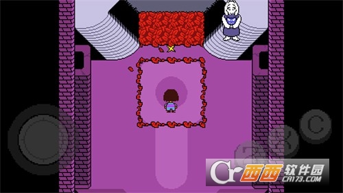 2、传说之下跟随着Toriel前往至遗迹的入口,在花丛当中会遇到第一个保存点(星星)。Toriel不假思索地告诉你这里就是你的新家。进入到第一个存档点北面的房间,Toriel会亲自把这个房间的谜题给解决,所以直接穿过北面的门即可。随后进入到东西向并且有两条小溪长廊上,Toriel需要你去拉下墙上有标记的杆子,一共需要拉下两个,那么东面的尖刺陷阱就会被移除。