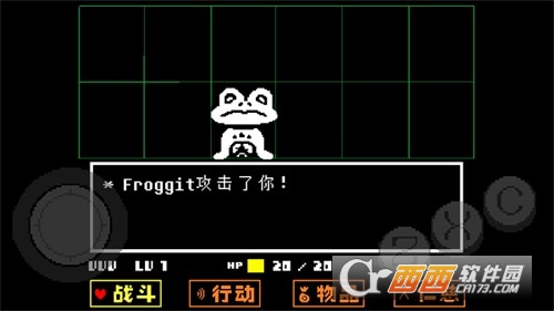4、去到北面的藤蔓房间内会遇到青蛙froggit,选择“行动——赞美”,虽然青蛙不知道你在说什么,但他变得很开心,他就会逃离战斗。在右面的水池上有一个尖刺陷阱,Toriel会牵着你的手通过这个陷阱区域。