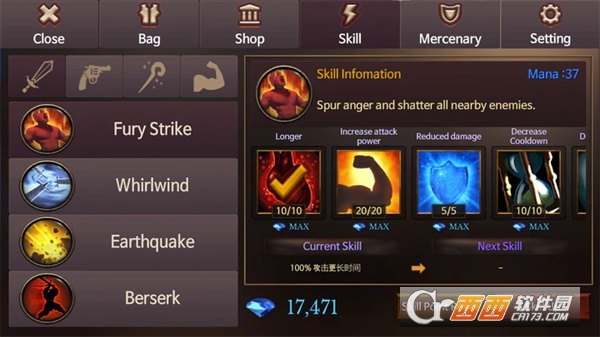 技能:分主动和被动技能,可以靠掉落的小钻石进行升级,被动技能不关心当前武器,一直能生效,装备里也有加被动技能等级的装备。
