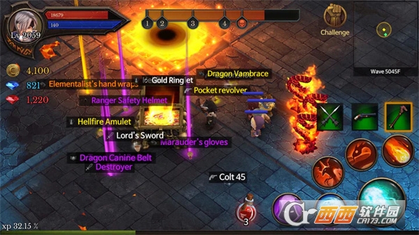 装备: 游戏有剑棍/枪械/法杖三系武器,左边按钮点击即可切换,使用不同系的武器,就会切换到对应的主动技能图标。每系下的武器有细微差异,比如枪械分双枪(单杀速度快)和来福枪(群攻片伤,但速度慢)。