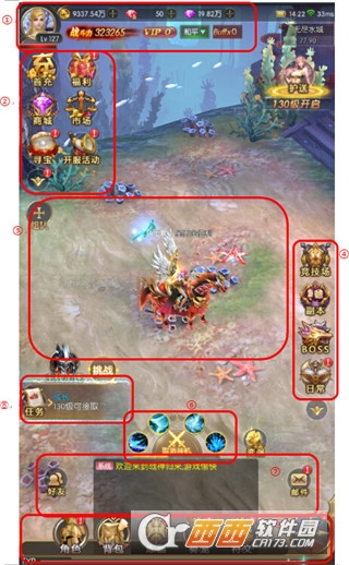 ①:玩家信息区,包括玩家等级、血量、战力、金钱、钻石数据等;