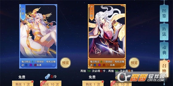 最后一个召唤界面就是获得兵魂伙伴的途径,分为每次购买1个陨铁砂(蓝、紫、红)和购买5个陨铁砂(蓝、紫、红、橙),十连抽会保底出红卡。阶级和品级越高的伙伴属性越好,能够转化给玩家的属性也越好哦。