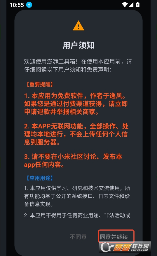 1、用户在游娱下载澎湃工具箱app,点击同意。