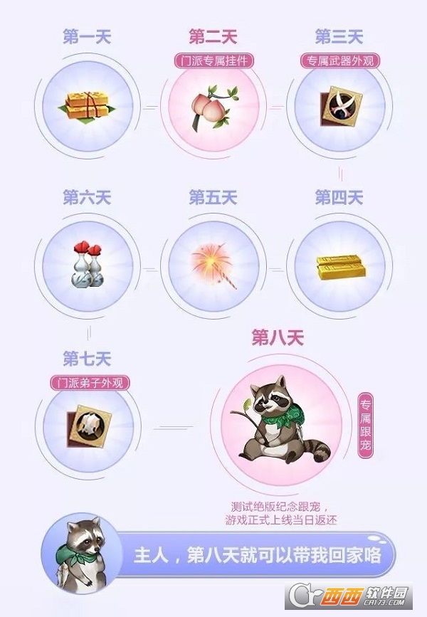 少侠在首次到达稻香村后的12天内累计签到8天,即可获得专属门派外装和本次测试绝版专属跟宠“念念”等丰厚福利,被领取后的【跟宠·念念】还可在游戏正式上线后返还哦~