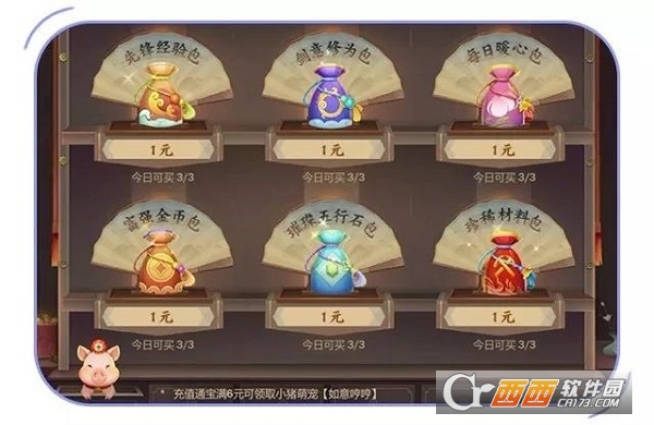 每日礼包,每日限购3个,分别包含上品纳元丹、上品玄心丸、五行石、金条、紫色材料宝箱、金月糕,三倍价值量,等于打三折!可以说超划算惹~