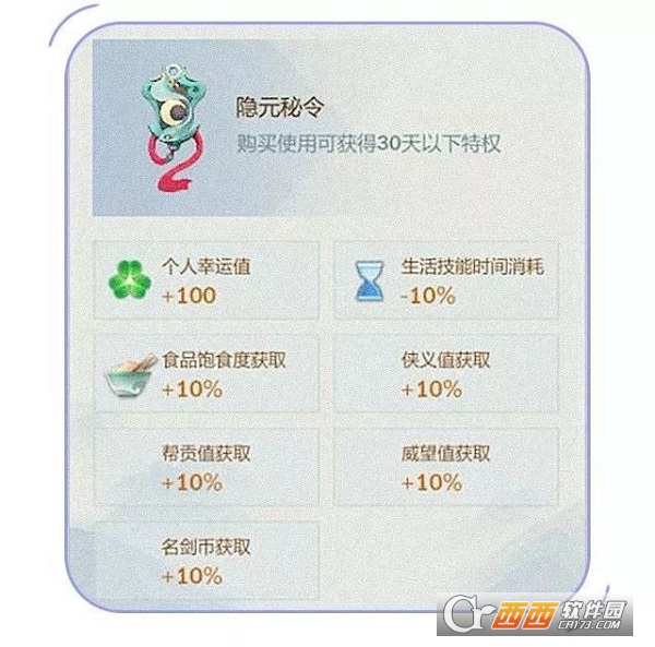 开通月卡【隐元密令】,可享受个人幸运值、食品饱食度、名剑币等多方面buff效果,修炼先人一步,助力大侠之路!